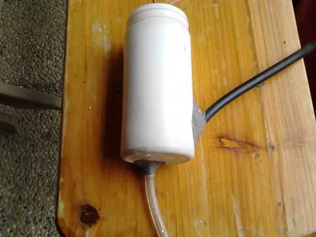 Después de esto crean los agujeros en envase cilíndrico, entonces se deslizó la bomba suministra ya sus pipas. Después sellé con un producto de silicona que llené también parcialmente el Interior del recipiente para evitar entradas no deseadas.