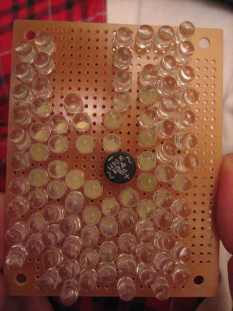 1. plan de -Coloque los LEDs en su ubicación aproximada. Usted se encontrará cambiar las ubicaciones de los LEDs en orden para ellos para caber en el perfboard, así que este paso es crucial. Asegúrese de seguir los cálculos y utilizar los resultados para determinar cómo colocar los LEDs. Tenga en cuenta que se conectarán de positiva a negativa en cada serie, y todas las series se conectar positivo con positivo y negativo a negativo. Por ejemplo, conectar 46 LEDs juntos, positivo a negativo y luego conecte todos los positivos y negativos en cada extremo junto. En la conclusión de la etapa de planificación, tomé una foto para recordar donde había colocado todo.