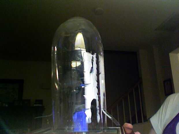 Una vez hecha la parte inferior, usted necesita cortar la parte superior del cohete dejando cerca de 11" a la izquierda. A continuación se cortan tres 2" x 1" ancho ranuras en la parte superior del cohete profundo. Esto debe dejo la zona donde estaba completamente abierta con 3 ranuras en las la tapa de la botella de soda. Doblar las ranuras detrás así que señalan, estos cortes son lo que se levante la parte superior de su cohete y soltar el paracaídas.