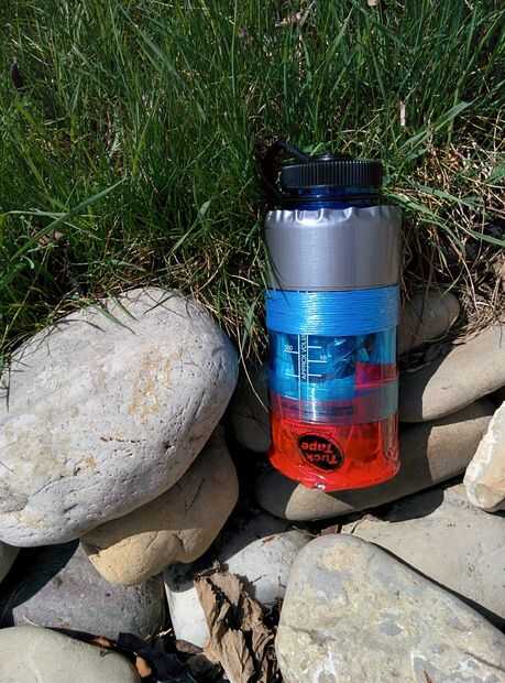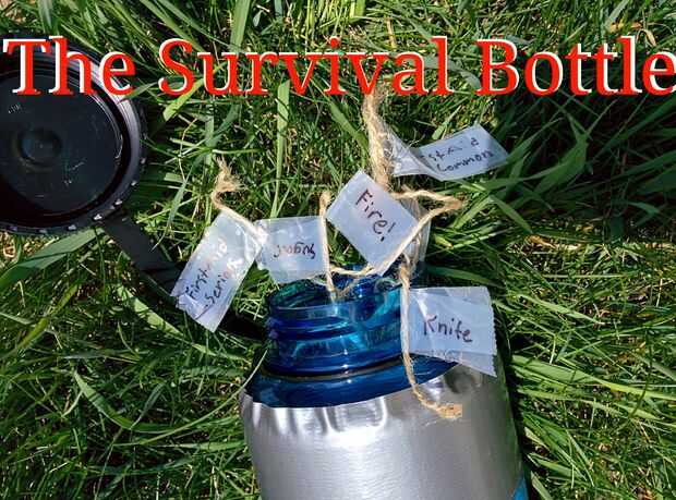 Este es un básico primeros auxilios y supervivencia paquete inteligentemente contenida en una botella de agua de 1L. Tiene todos los elementos básicos: fuego, pesca, primeros auxilios, alimentos, herramientas y balizas de salvamento.