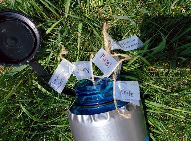 Así que en la introducción prometí una inteligente manera de caber todo en una botella de agua de 1L. Así que una vez que todo está en su propia bolsa de atar una cadena sobre dos veces como la botella de agua es alta alrededor de él, debe ser suficientemente largo para envolver alrededor de la bolsa y aún llegar a la cima de la botella. Adjuntar una etiqueta hasta el final de la cadena y proceda a colocar todo dentro de la botella. Entonces cuando la situación garantiza que solo tire de la cadena para reclamar el artículo estaban intentando conseguir. Funciona bien pero algunos se debe colocar lo utilizada con menor frecuencia en primera.