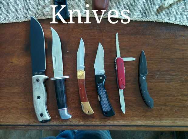 Los cuchillos que son unos cuchillos comunes que podrás encontrar en cualquier lugar. Todos caben en la botella y están muy barato ($7-$20), sin embargo si en todo eres una persona seria de al aire libre les recomiendo que compren un buen cuchillo, la diferencia es de noche y de día. El cuchillo más peligroso es aburrido, como que no se comportan bien tienden a soltarse y causar lesiones.