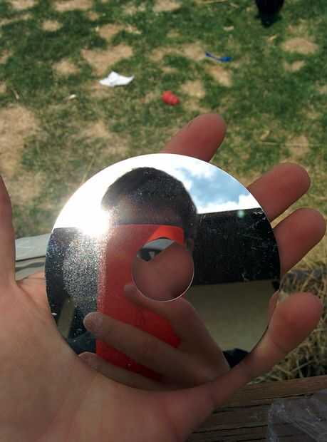 Un espejo es una gran manera de la señal de un avión o un barco. Yo personalmente uso un viejo disco de disco duro en lugar de un espejo de cristal tradicional, la placa es de metal pero pulida a un brillo de espejo por lo es menos frágil que el vidrio tradicional espejo, también tiene un agujero en el centro por lo que el método tradicional dedo de ubicar la reflexión es irrelevante.