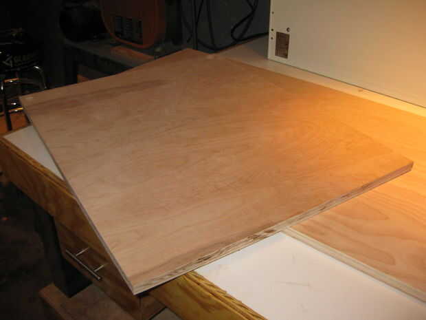 Venga, sí... madera contrachapada de 3/4". Mi espacio elegido podría dar cabida a 30 "x 24", por lo es lo que fui con. Taladré agujeros en las esquinas superiores, por lo que pude colgar del techo, evitando así la necesidad de perforar la pared de hormigón.