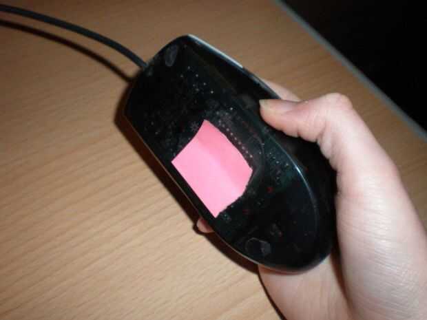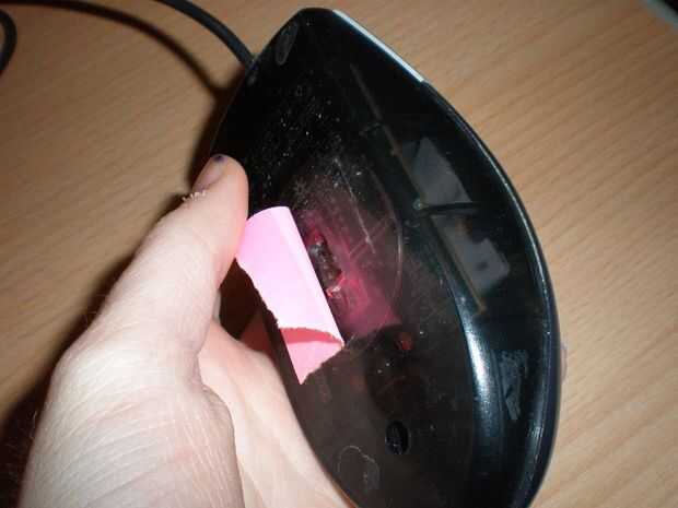 Así que, colocando un pice de papel (vamos a usar notas adhesivas) en el ratón el rayo infrarrojo solo 've' el papel para que el cursor no se moverá, no importa cómo duro o mucho la víctima tiembla el mouse!!!