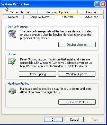 En XP, haga clic en la pestaña que dice "Hardware", haga clic en buscar y haga clic en "Administrador de dispositivos".