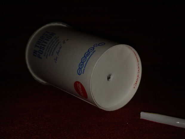 Primero tome su taza vacía y colocar boca abajo. Ahora marque aproximadamente el centro de la base con su lápiz o cortantes objeto. Cuando han terminado este peirce el agujero que sólo han marcado para el mismo tamaño que el diámetro de la pajita.