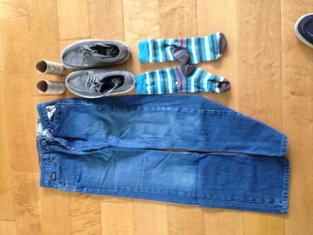 Obtener rollos de un par de calcetines y pantalones, 2 papel higiénico (o papel) y un par de zapatos.