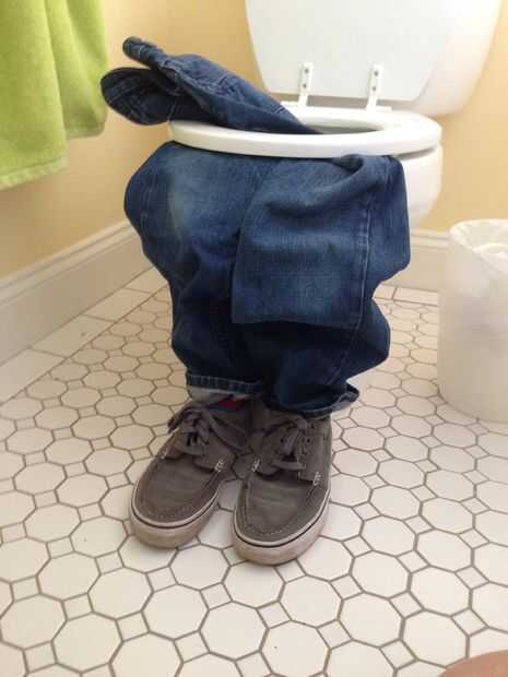 Coloque los pantalones sobre el conjunto de zapato, luego poner los pantalones bajo el asiento del inodoro para que no caiga el pantalón.