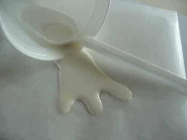 - Apriete una cucharada de pegamento dentro de la taza, permitiendo a derramarse en el papel de cera.