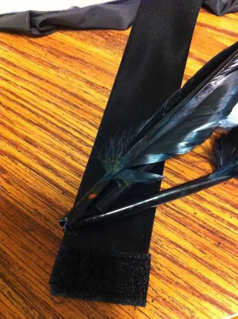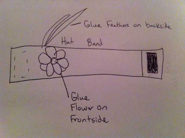 Coloque la cinta alrededor de su sombrero y dejando un poco extra para añadir el velcro cortó la cinta. Entonces añadir el velcro, "pegajoso" lado velcro a un extremo y "suave" lado del velcro al otro. Perno en lugar y coser con el color de la cinta es de hilo. He doblado mi cinta bajo y luego cosido para evitar que se deshilache. Luego pegamento caliente sus plumas en la parte inferior de la banda de sombrero y la flor en el exterior de la banda de sombrero.