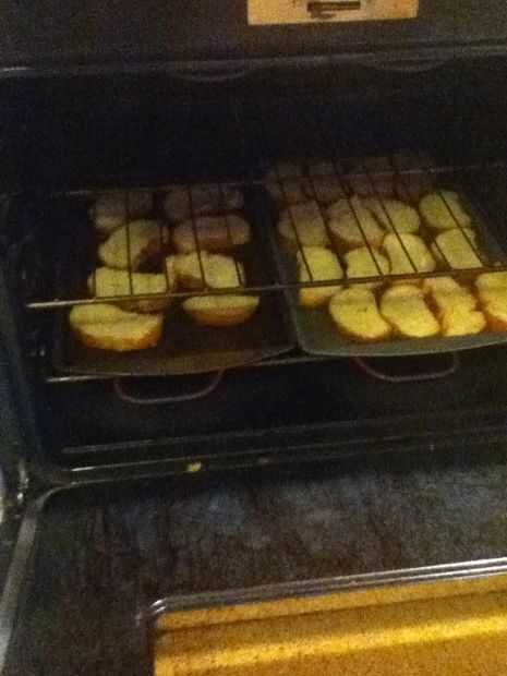 Ahora que el pan está en las bandejas, colóquelos en el horno a 350° F hasta que se tuestan ligeramente. Vas a tener que trabajar rápidamente para los próximos pasos porque el pan se tueste.