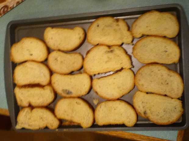 Tomar la masa de pan y empezar a rebanarlo cerca de una rebanada cada centímetro y ponga las rebanadas en una bandeja (o dos). Probablemente no van querer que sean mucho más grueso ya que probablemente sería demasiado crujientes!