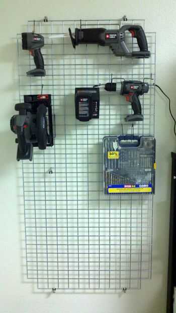 Compré un kit combo de Porter Cable en una tienda de hardware y para lo que pagué por él, no quiero sólo aunque todas las agradables nuevas herramientas en la bolsa que vino con y ocultar mi inversión. Cuando compré mi banco de trabajo móvil vino con un estante de rejilla metálica de la parte inferior. Sin embargo no quería el estante porque quería utilizar el Banco como un escritorio. Sostuve el estante contra la pared y pensé, "qué impresionante sería si hice esto en una pantalla de almacenamiento de la herramienta".