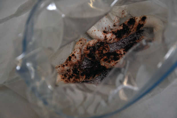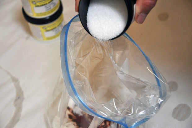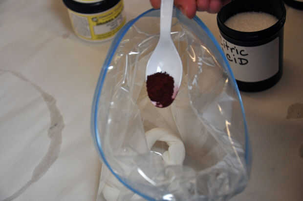 Con aproximadamente 1 cucharada de ácido cítrico, espolvorear sobre su pañuelo mojado.