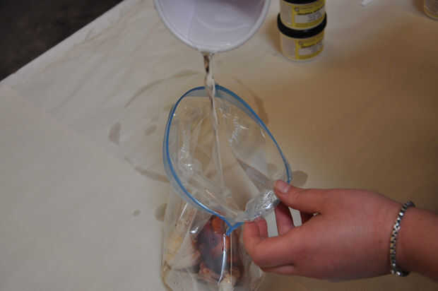 Vierta suficiente agua para saturar su bufanda, alrededor de 1/2 taza dependiendo del tamaño de la bufanda. Ensuciarse la bufanda alrededor para ayudar a conseguir el colorante y ácido cítrico disuelto y penetró en la bufanda.