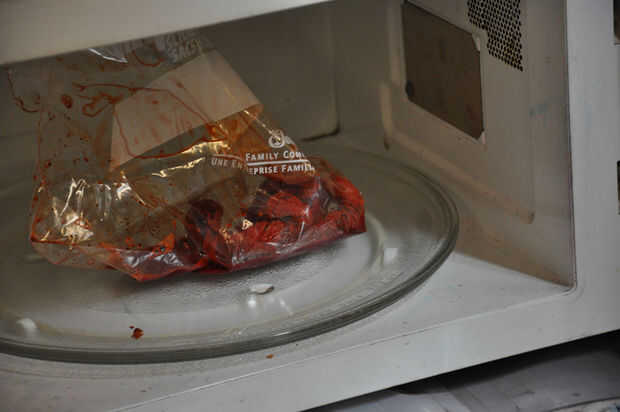 Microondas en alto por unos 2 minutos mantener un ojo en él, la bolsa se hinchará y puede que necesite hacer una pausa en el microondas para darle tiempo a desinflarse.
