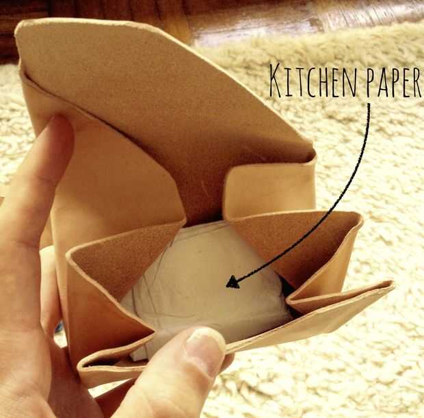 Una vez terminado poner algo suave y pesado en la parte superior para dejar que se seca en la forma que desea. Deje que se seque lentamente y a fondo. Sin microondas, sin horno, sin radiador. No soy paciente, pero que realmente destruiría muy pronto! Mina estaba muy mojado y tomó casi dos días completamente seco. Este es un muy buen momento para experimentar cómo molesto es su vieja cartera.