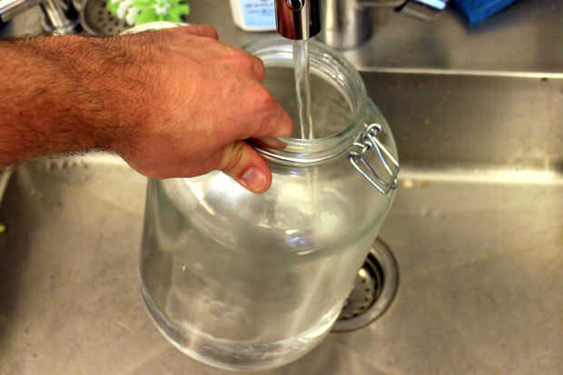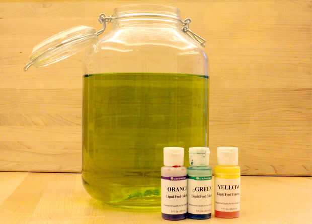 Llenar la jarra sobre a mitad de camino con agua, usé una mezcla de colorante alimentario líquido amarillo, naranja y verde teñido el agua para asemejarse a una solución de preservación. Como en las películas de ciencia ficción vintage.