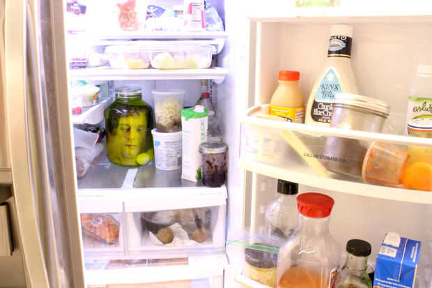 Coloque el frasco en nevera. Tal vez se ocultará detrás de algunos artículos para que una persona tiene que estar cavando para encontrar, o tal vez lo dejas derecha arriba arriba a asustar a gente como inicialmente abren la nevera.