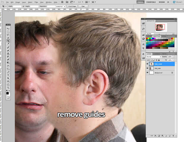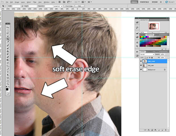 Seleccione la herramienta de borrar y establecerlo en un cepillo suave. Borrar el borde de la foto de perfil donde se unen las dos caras. Cambiar la opacidad de la goma de borrar puede trabajar el pincel a la pluma, algunos de los detalles y mezcla las dos imágenes.