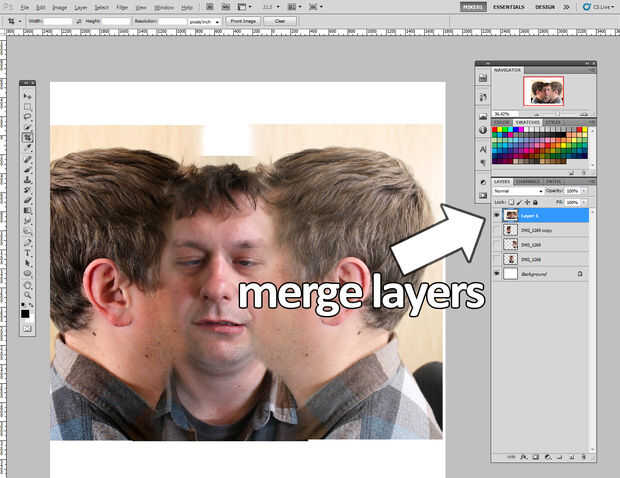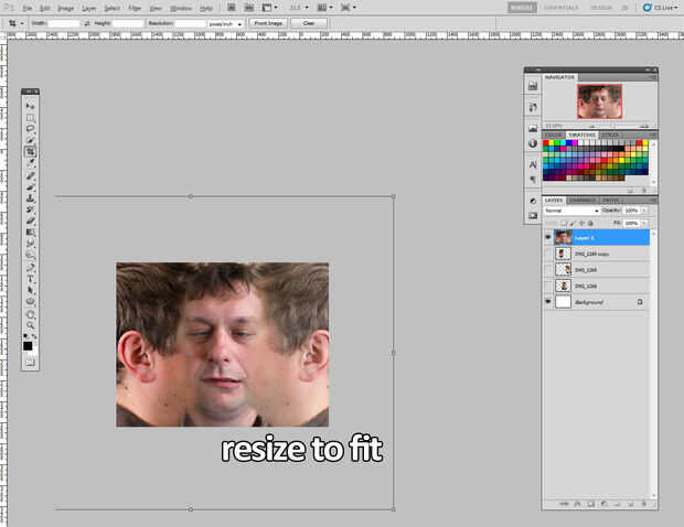Cuando esté satisfecho con la colocación de la capa, mezcla e iluminación niveles, fusionan las capas. A continuación, cambiar el tamaño de la imagen para adaptarse a su espacio de papel. Puede ampliar la imagen a recortar el cuello y parte superior de la cabeza, o pueden trabajar más magia de cepillo en estas áreas; como con la herramienta Tampón de clonar, o la herramienta de predicción (dependiendo de su editor de fotos)
