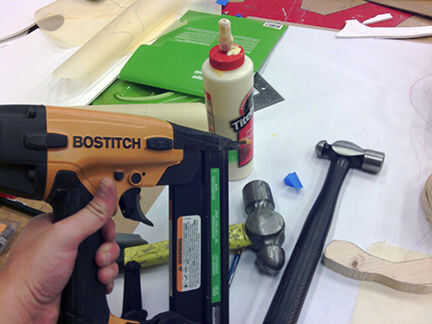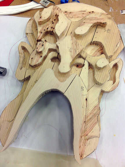 Estoy usando pegamento y una clavadora para ensamblar todas las piezas. Estos dos métodos de fijación crean un vínculo bastante fuerte, que compensa el hecho de que mi pieza está hecha de piezas de madera al azar. Una vez que están montados, empieza a parecerse a la cabeza que estoy tratando de crear.