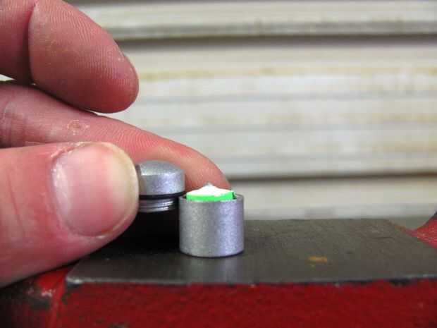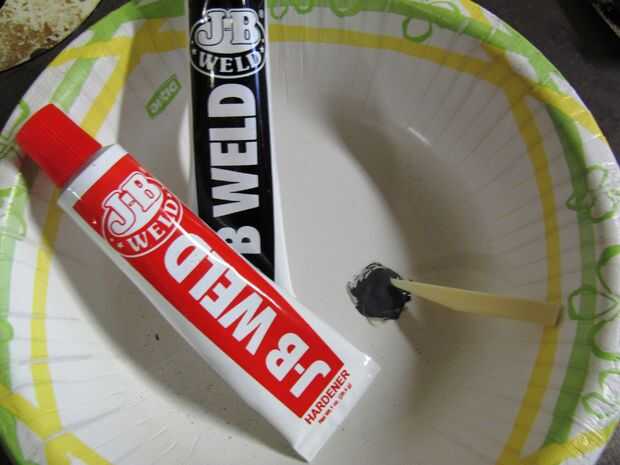 Una vez terminado este paso puede J.B. soldar la parte superior de la caché para el extremo recto del perno que sólo haya presentado abajo. Para mantener todo estable pongo la memoria caché dentro de la tuerca con una de las arandelas de 5/16" en la parte inferior. Mezcle partes iguales de la soldadura de J.B. y aplique una pequeña cantidad al final presentado del perno de corte. Tenga cuidado de no pegar accidentalmente todo a la tuerca!