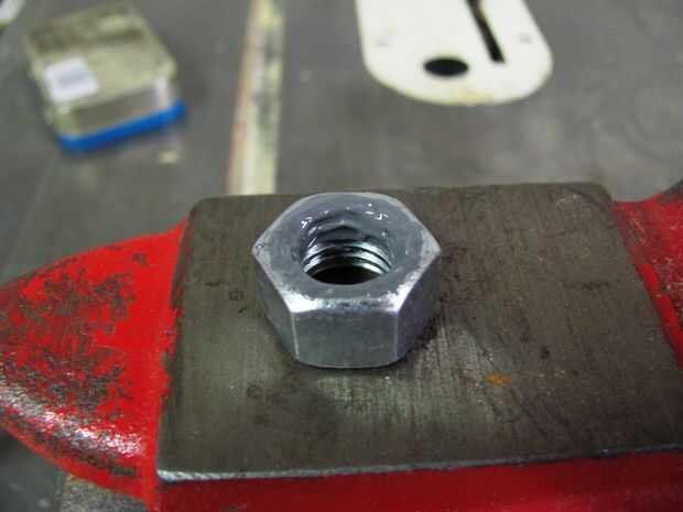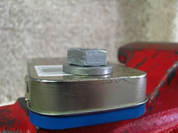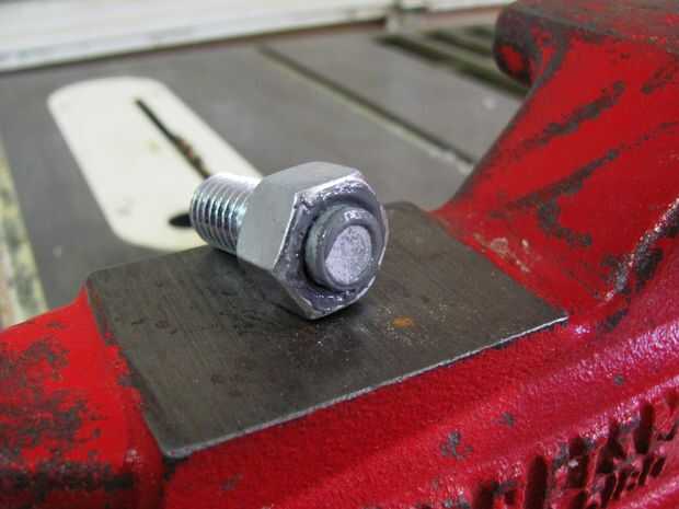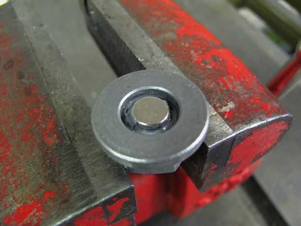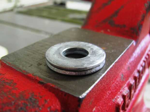 Fije la cabeza del perno hexagonal en el tornillo de banco con el imán hacia arriba. Mantenga la lavadora firmemente con ambas manos (J.B. soldadura hacia abajo por supuesto) y con cuidado coloque la arandela en la cabeza del perno, no desea que el imán para agarrar la lavadora será desordenado. Lugar para secar.