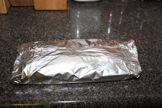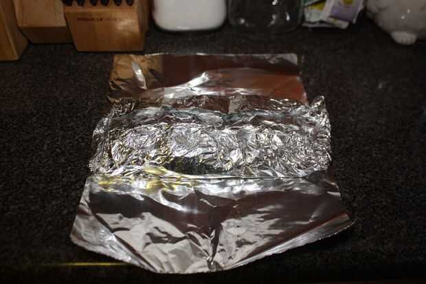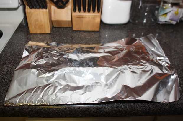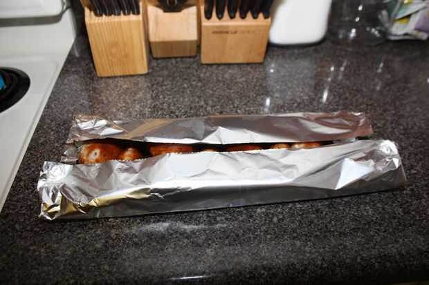 Tercera, las patas de pollo parcialmente envuelto en el papel de aluminio del tirón en la parte superior y doble como lo hizo la primera hoja. Paquete apretado.