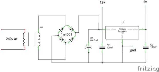 Pero no es seguro alimentar el proyecto con 120v o 240v (no incluso pensar en intentarlo, soplará para arriba todos sus sensores y arduino). Para que sea trabajo, necesitamos un convertidor que convierte que 120 o 240v ac a estable y seguro 5-12v dc. Para esto que usted necesita para hacer una potencia de la fuente convertirá la corriente.