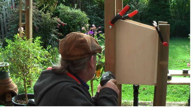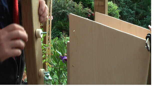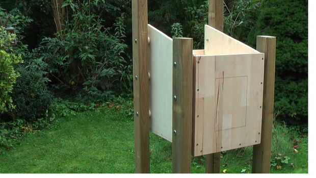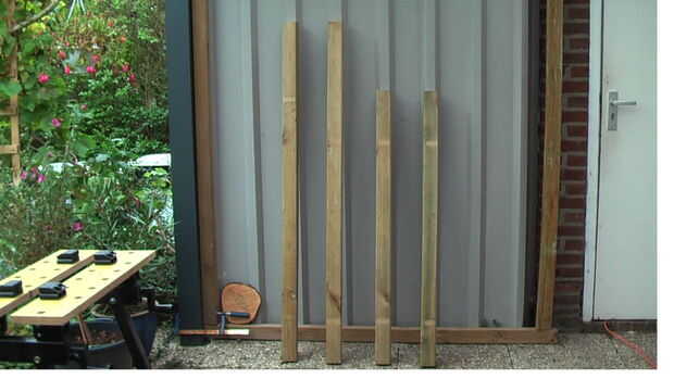 Las piernas están hechas de madera impregnada. La sección transversal es 6,5 cm por 4,5 cm o pulgadas 1,77 por 2,55 pulgadas. Las patas delanteras son de 120 cm o 47,2 pulgadas, la espalda las piernas 150 cm o 59 pulgadas. Colocar las piernas a la caja es un trabajo preciso. Utilice un nivel y las abrazaderas. Entre la caja y las piernas he usado bolsa ronda los espaciadores del diámetro 16 m m o 0,62 pulgadas de espesor y 3 cm o pulgadas 1,2. Espaciadores de dan la impresión de que la caja está flotando entre las piernas. Esta es sólo una elección estética.