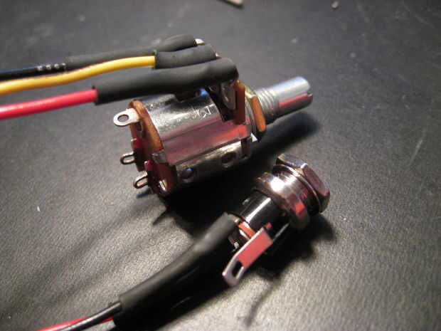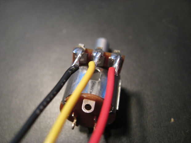 Asir esa pote 10kΩ. Con su perilla frente a usted, la soldadura en los cables - negro, amarillo, rojo entonces. Deslice hacia abajo el termo retráctil y reducirlo.