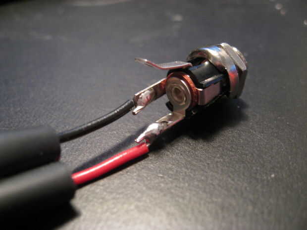 En primer lugar, conectar los hilos 1MΩ resistencia. Grab su 2,1 mm conectar y soldar el cable rojo en la ficha de post centro soldadura el cable negro en la ficha de barril tenga cuidado de no soldar la pestaña detector por accidente. Deslice hacia abajo el termo retráctil y reducirlo.