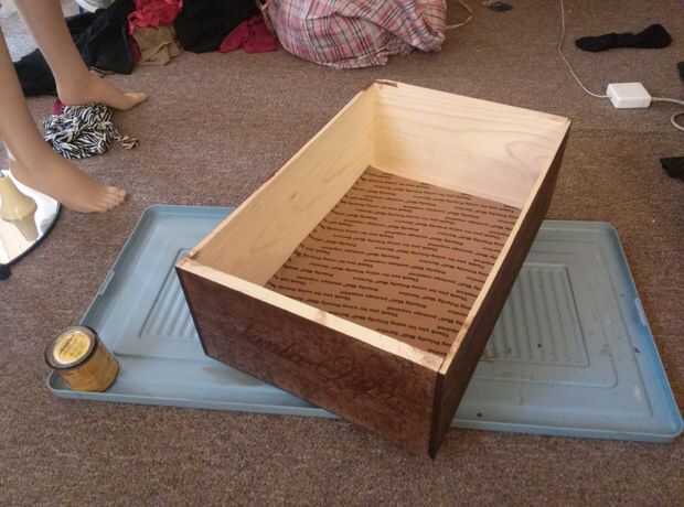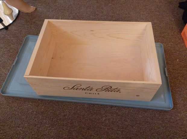 Vino y vino de la caja en la mano (como compraría sólo la caja), procedí a manchar el exterior con un tinte o sellador poliuretano.