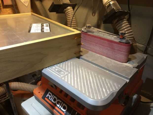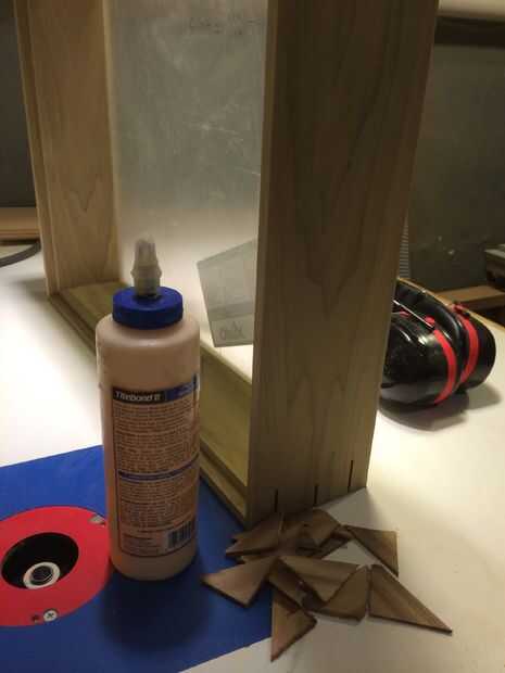Las ranuras fueron cortadas usando mi trineo de corte estriado, que puede verse en mi gramófono y madera 6 paquete de Instructables. Las ranuras fueron cortadas de trozos de álamo, ásperos cortado en triángulos en la Sierra de cinta y luego pegar. Una vez seco, que cortado la masa usando la Sierra de cinta, arena más cerca con la lijadora de banda oscilante y luego lijar al ras con una lijadora orbital.