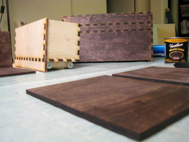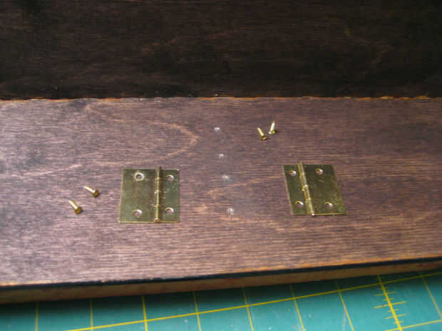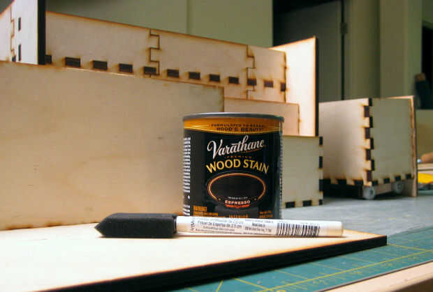 Preferí a manchar el interior de la caja. Tuve una mancha de aceite que podría haber interferido con conexión y resistencia del pegamento si algunas manchan tiene en las articulaciones así que esperé hasta que el cuadro fue terminado sobre todo antes de la tinción.