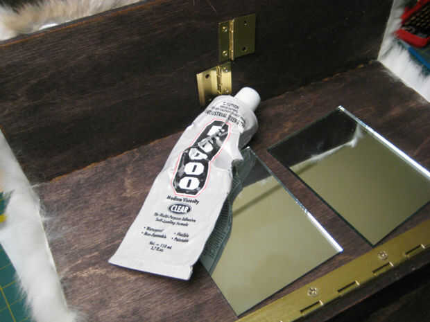 Quería unos pequeños espejos en el cuadro que se podía ajustar para el mejor ángulo al aplicar el maquillaje. Adjunto un par de bisagras y pegar los espejos a las bisagras con pegamento E6000.