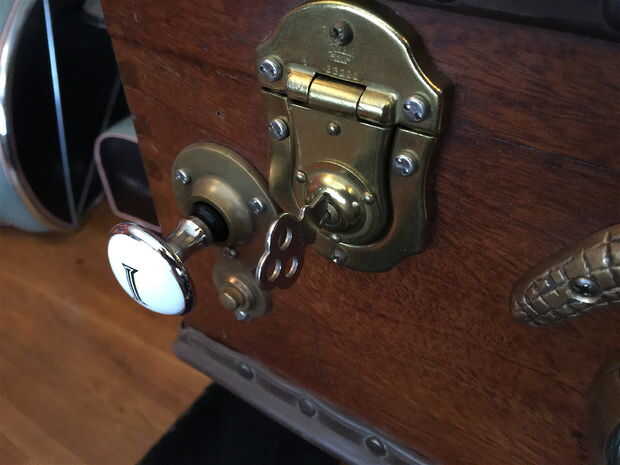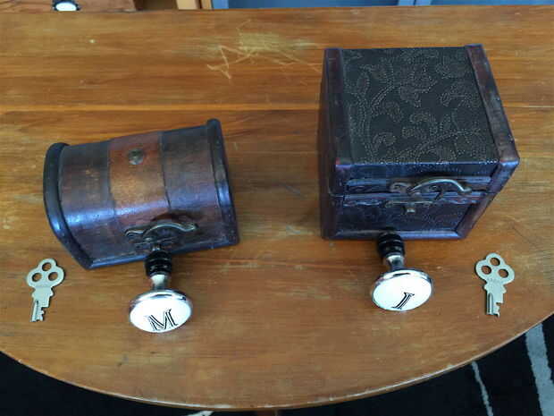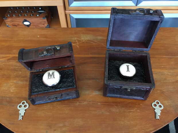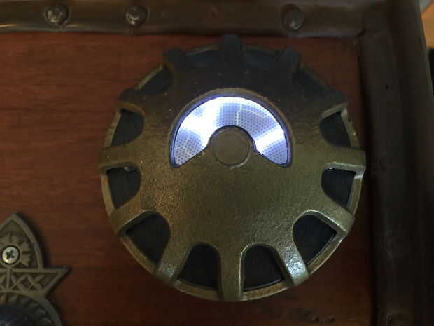 La caja es alimentada por una batería de 12 voltios. Para convertirlo en dos disparadores magnéticos debe colocarse en el panel frontal de la caja. Estos factores desencadenantes fueron hechos de partes de perchas de pared que encontré en costo más. He les había desmontado y había añadido imanes pequeños discos en forma a los extremos. I y M son las iniciales de mi niño. Cuando se encuentra la localización apropiada para los gatillos, dos interruptores magnético "REED" (extraño aberturas en dos biseles de antiguo timbre correspondiente), conectados en serie están permitiendo actual para fluir con el resto de sistemas de la caja. Cuando esto sucede, el generador de Plasma "Plasma disco" se enciende dejando la apertura persona o las personas, saber que han encontrado el interruptor de encendido, jajaja. Discos de plasma se pueden encontrar en Ebay.