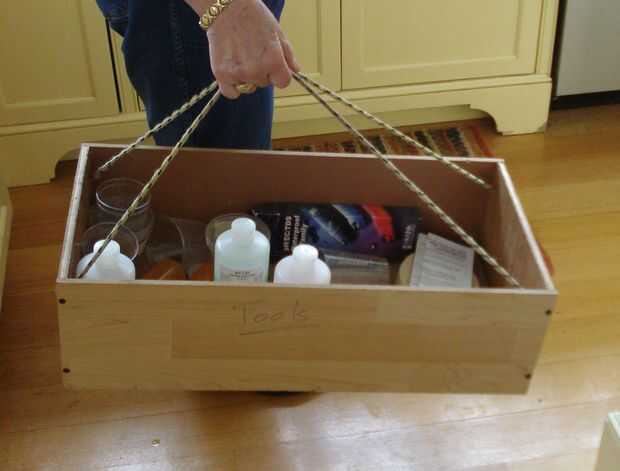 Un pedazo de cuerda por los extremos de la caja de hacer un buen mango para llevar la caja. Completa con herramientas y tomar 2 pies cúbicos de herramientas (uno en cada mano) para su proyecto. El tamaño de la caja es bastante bueno para las herramientas, todo más grandes y es fácil de hacer demasiado pesada para llevar a la caja. Ver la imagen.