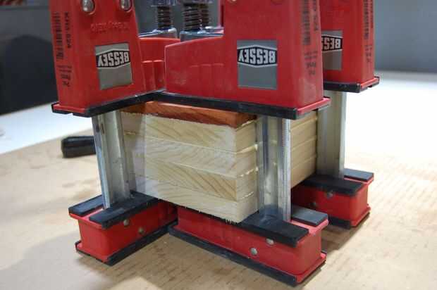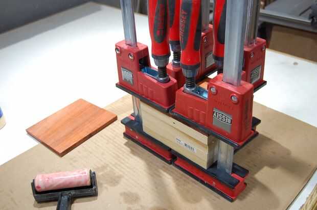 Pegamento para arriba es fácil... Unte pegamento en un lado de cada placa, apilarlos, añadir abrazaderas. Deliberadamente he dejado un lado de padouk de este pegamento inicial hasta. Cabe mencionar que tomé granos patrón y orientación en cuenta. Utilicé la pieza más interesante aspecto de padouk para el frente y arregló que el álamo las piezas para que la dirección de grano volteado con cada capa... como un zig zag supongo.