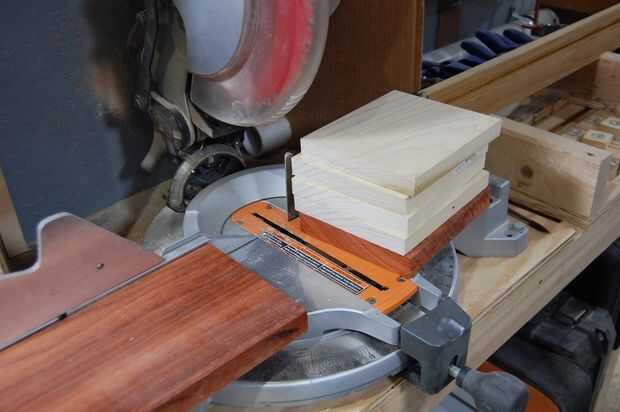 Cortar cuatro piezas de 6 1/2" de la Junta de álamo y de un tablero de padouk. Para obtener más millaje en el padouk, decidí volver a verla en vez de usar completo 3/4" espesor juntas en la parte delantera y trasera.