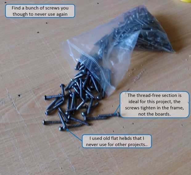 Para montar sus piezas y extienda en comparación con el marco, revise todo una última vez. Ver si os gusta el espaciamiento entre las juntas (yo usé ~ 2 cm entre las placas). Y para este paso necesitas ~ 50 tornillos de 20-25 mm. No deben ser más largo y el grueso de 1 tablero y 1 rayo combinado, de lo contrario se pegan hacia fuera!