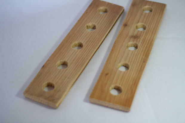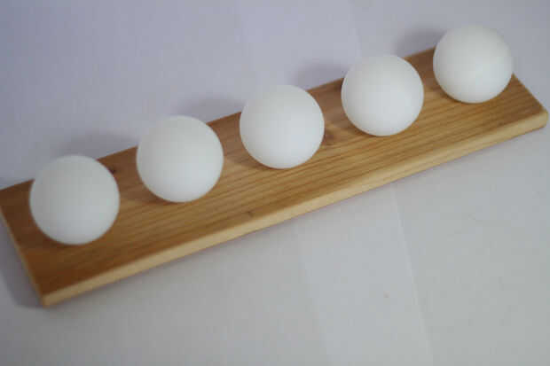 Simplemente tuvo dos pequeñas tablas de madera y cinco agujeros en ellas perforados. Los agujeros deben ser lo suficientemente grandes como para mantener fácilmente las bolas, pero no demasiado grande para que sólo entren a través de. También deben ser espaciados uniformemente y no demasiado cerca de uno al otro.