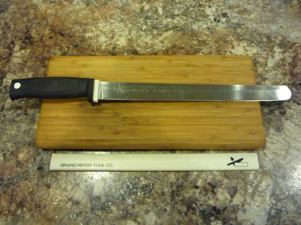 Uno otro cuchillo que usted realmente debe tener es un hacker decente, ideal para filetear un lado o salmón o rebanar un asado de carne de res, mina era un poco demasiado para mi caja tuve que vi la manija hacia abajo para efectuar lo necesario. Yo uso una máquina de cortar de cuchillería de Chicago.