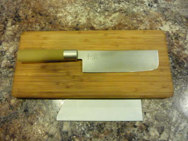 o un nakiri estilo japonés; también conocido como una cortadora de vegetal. Yo uso un shun de su línea de wasabi de cuchillos.