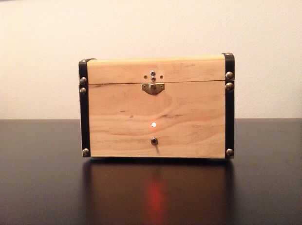Una caja con lector rfid, pantalla lcd y servo para abrir un cerrojo. Construido como una caza del tesoro para una fiesta de cumpleaños de la hija de 7 años.Los niños tuvieron que recoger cinco tarjetas de RFID y los pase en un orden correcto sobre l