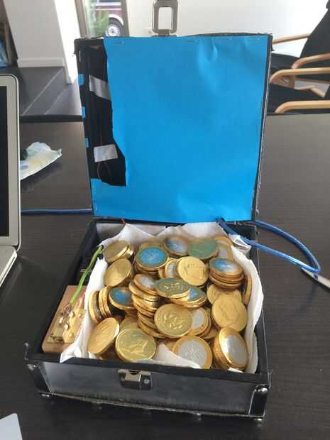 Los niños tuvieron que recoger cinco tarjetas de RFID y los pase en un orden correcto sobre la caja para abrir la caja y encontrar las monedas de chocolate dentro.