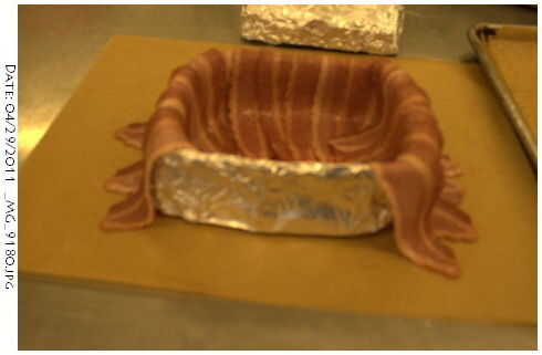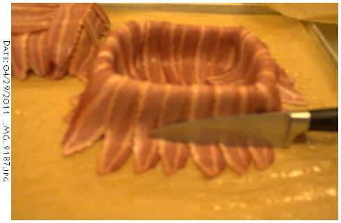 Ahora sobre el regazo su tocino como colocarlo alrededor de la base de su dejar de caja que cuelgan de los extremos del lado