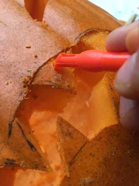 Para dar a los dientes y los ojos más definición, utilizar el raspador de arcilla o lo que usted eligió la herramienta y raspar a la piel de la calabaza en cada diente y la pupila de los ojos. Lo que hice fue en primer lugar, utilice la esquina de la rasqueta y una línea baja más allá de la capa de la piel que fue a lo largo de la orilla del diente donde conecta con el resto de la calabaza, luego raspar cuidadosamente el resto de la piel en el diente. Mismo para los alumnos, pero esta vez la línea que corte con el ángulo de la rasqueta se curva alrededor del borde del ojo.